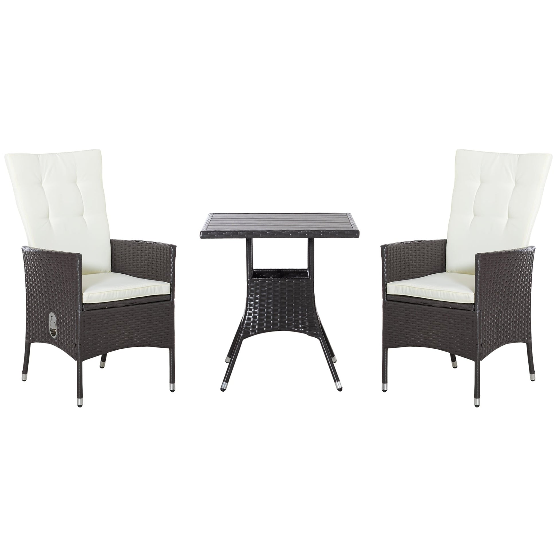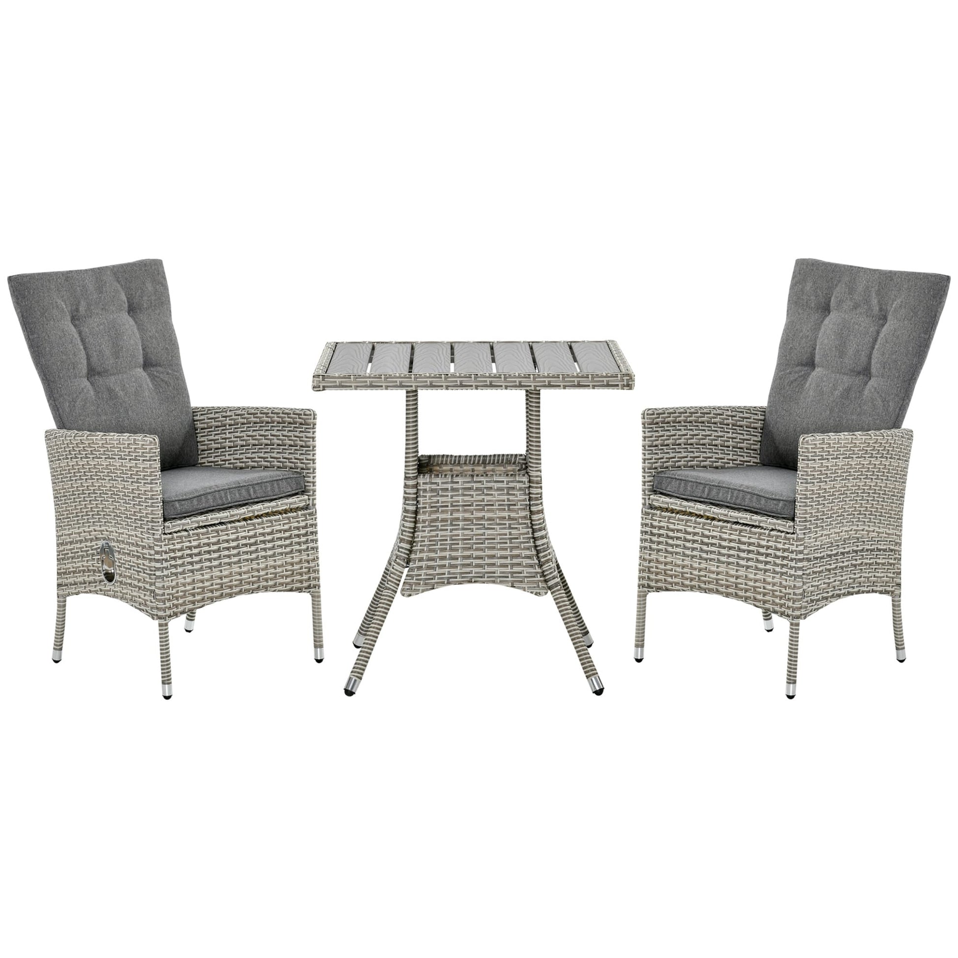 Bring the comforts of indoors outside with Outsunny. Our three-piece patio furniture includes two reclining wicker chairs and an outdoor coffee table. Sit back and relax on a thickly cushioned seat and a high-rise backrest that reclines. The coffee table has a stylish woodgrain design laid out into slats to help it drain after rain. Our PE rattan has all the handwoven style of classic wicker with better resistance to water and weather. Get out, get comfortable, get Outsunny.