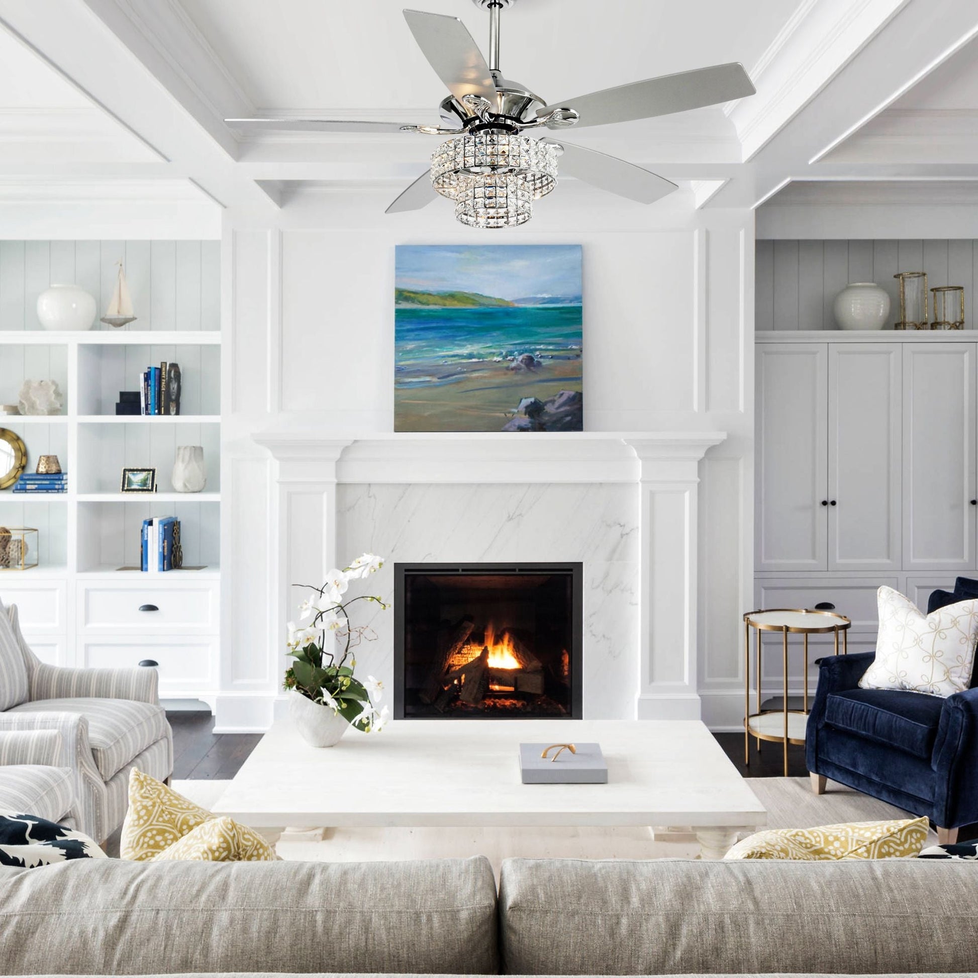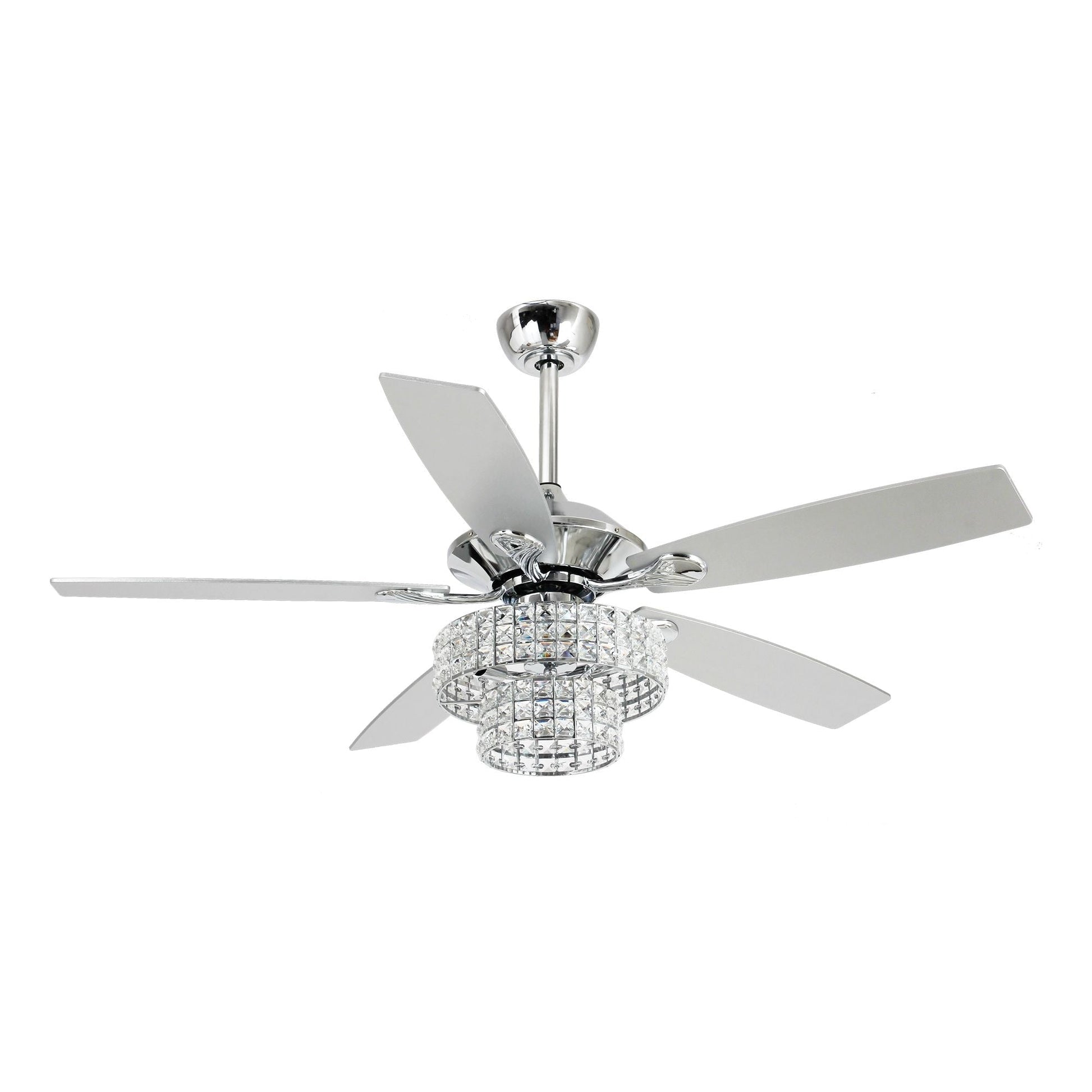 Ventilateur de plafond moderne à 5 pales en chrome et bois de 52 pouces avec télécommande et cristaux.