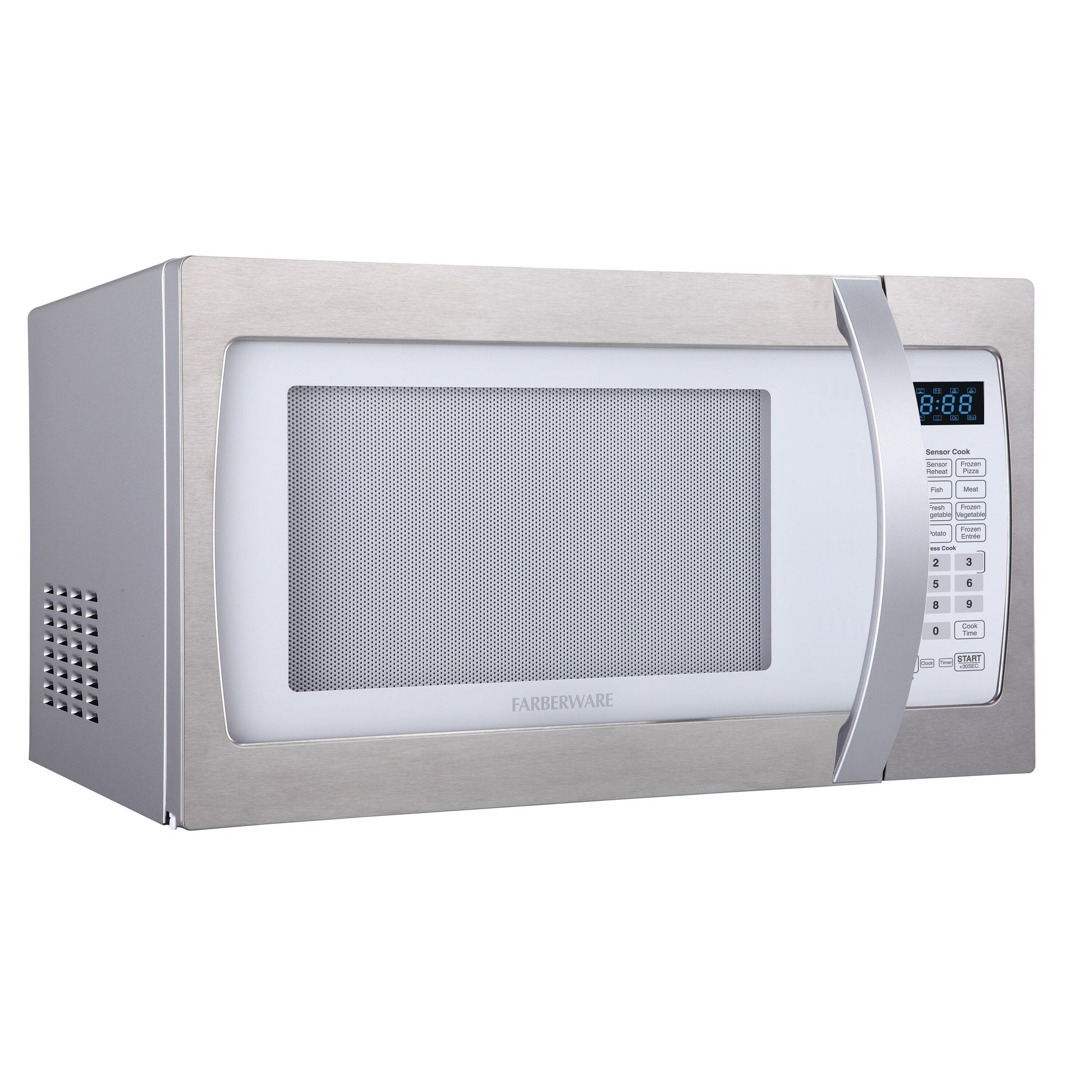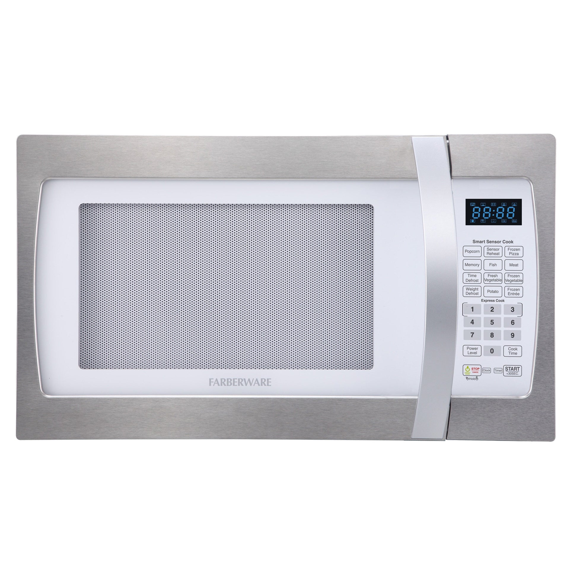Four à micro-ondes Farberware Professional de 1,3 pi³ et de 1100 watts avec fonction de cuisson intelligente à capteur, blanc et platine
