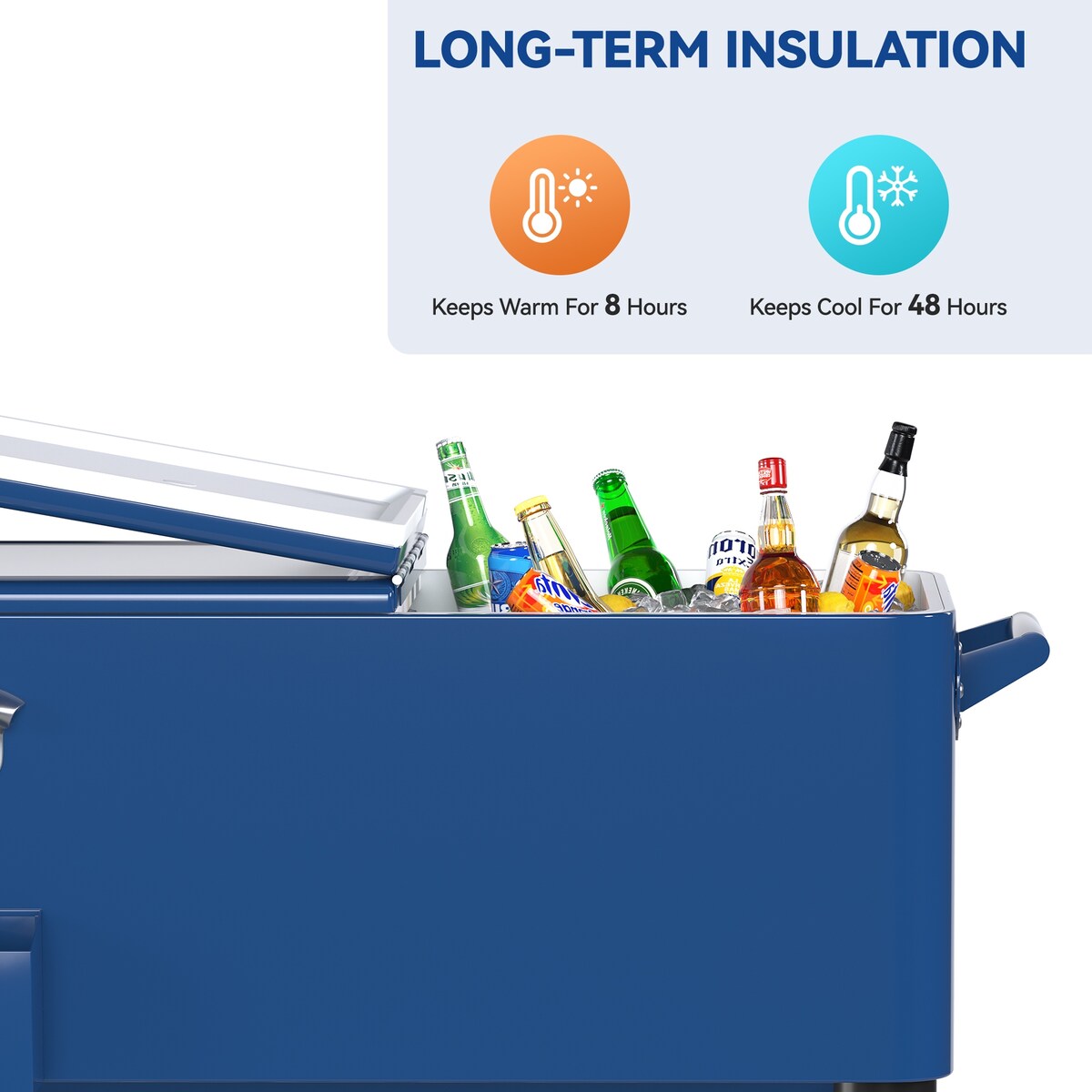 Rehaussez votre expérience de divertissement en plein air avec notre glacière de patio de 80 quarts, offrant une capacité de stockage ample pour garder plus de 100 canettes ou plus de 55 bouteilles au frais jusqu'à 48 heures ou au chaud jusqu'à 8 heures. Ce chariot glacière portable est conçu pour plus de commodité, avec des roulettes pivotantes à 360°, des poignées ergonomiques et un espace de rangement supplémentaire pour une expérience de refroidissement ou de réchauffement en plein air sans faille. La glacière de patio peut contenir plus de 100 canettes ou plus de 55 bouteilles, gardant les boissons au frais jusqu'à 48 heures ou au chaud jusqu'à 8 heures. Parfaite pour les rassemblements ou les événements en plein air, elle vous assure d'avoir un large choix de boissons à portée de main. Très portable, le chariot glacière peut être facilement assemblé et démonté pour un transport pratique lors de vos déplacements. Emportez-le avec vous lors de pique-niques, de sorties de camping ou de toute aventure en plein air sans effort. Dotée de roulettes pivotantes à 360° et verrouillables, la glacière extérieure offre une maniabilité facile dans n'importe quelle direction. Transportez la glacière en douceur d'un endroit à un autre, que vous organisiez une fête dans votre jardin ou que vous partiez en camping. Conçue pour le confort de l'utilisateur, la glacière sur pieds est équipée de poignées robustes et ergonomiques sur les deux côtés, améliorant la mobilité et assurant un transport sans tracas où que vous alliez. Le plateau inférieur de la glacière portable offre une capacité de stockage supplémentaire, vous permettant de maximiser le nombre d'articles que vous pouvez transporter. De plus, un ouvre-bouteilles intégré avec un récupérateur de capsules fixé sur le côté offre un confort pour ouvrir les bouteilles et collecter les capsules.
