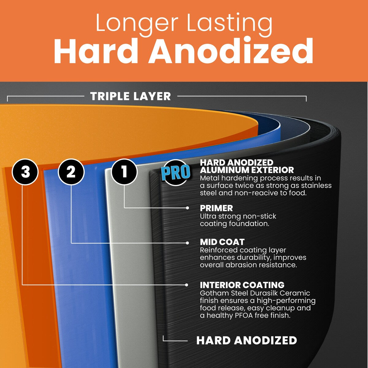 Anodisé dur : Conçu pour durer, le jeu de casseroles Gotham Steel Pro Premier est fabriqué en aluminium anodisé dur, plus résistant que tout acier inoxydable ou aluminium ordinaire, assurant une conduction rapide et uniforme de la chaleur à travers les casseroles, tout en résistant à l'usure et en garantissant des années d'utilisation exceptionnelle de chaque pièce.