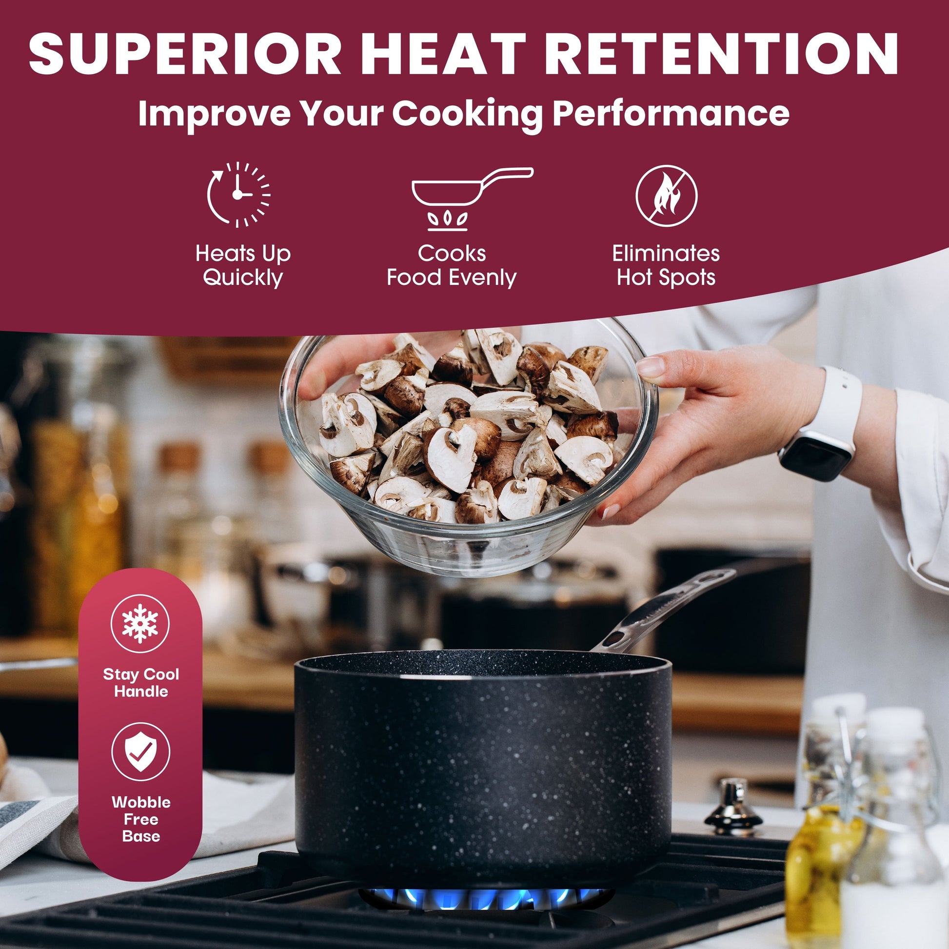 Sûr et adapté aux familles : Fabriqué sans PFOA, PFOS, plomb ou cadmium pour une tranquillité d'esprit ; les poignées qui restent froides au toucher et les bases antidérapantes ajoutent sécurité et stabilité à chaque séance de cuisine.