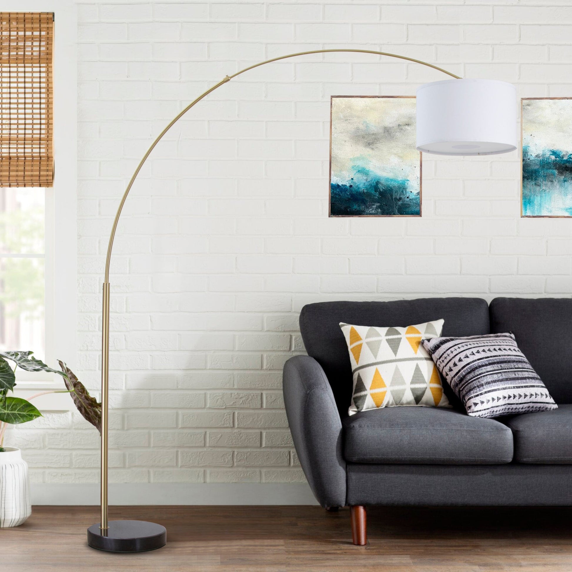Add a sophisticated touch to your living space with the Q-Max Steel Adjustable Arching 81-inch Floor Lamp. With its sleek modern design, this lamp stands tall on a sturdy marble base and provides ample lighting for reading or entertaining guests. The extra large shade and adjustable arched lamp provide versatility and style to any room.