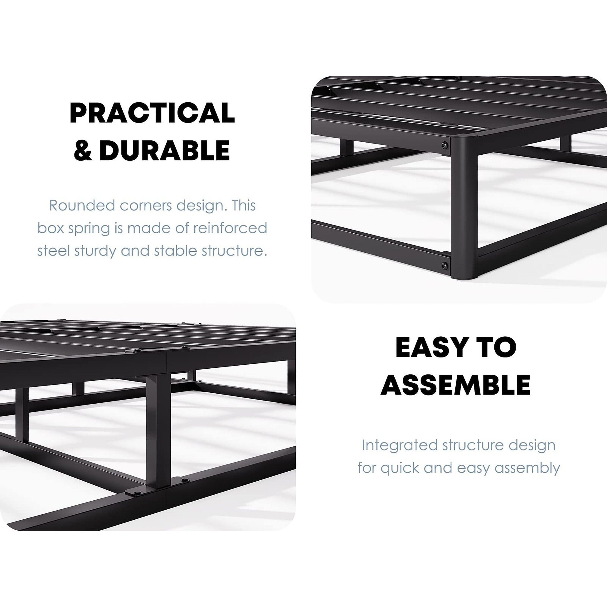 Soutien et longévité exceptionnels : des lattes métalliques robustes combinées à une structure en acier renforcé améliorent la durabilité, supportant jusqu’à 800 lbs pour les sommiers à ressorts de taille simple et 1500 lbs pour les sommiers de taille double. Cette base protège non seulement votre matelas, mais prolonge également sa durée de vie.