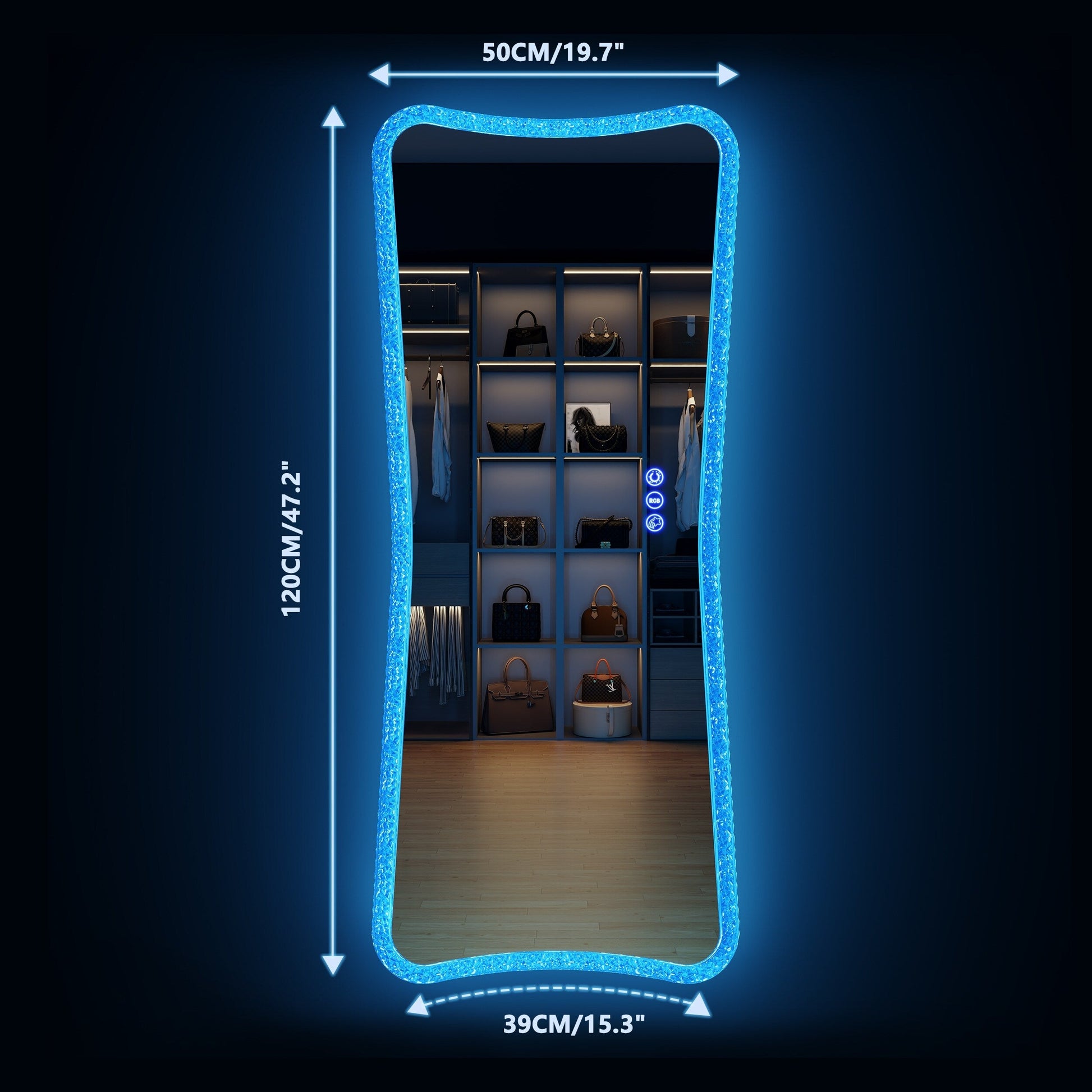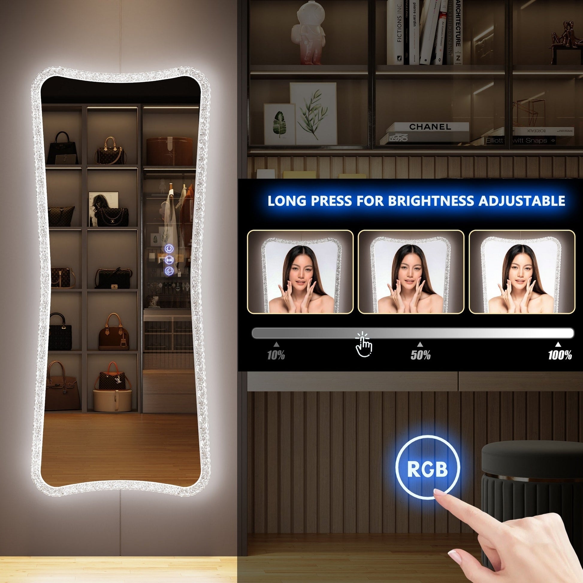 • Le miroir pleine longueur avec des lumières entourant une bande lumineuse à LED haute luminosité d'une durée de vie de 50 000 heures, avec 7 modes d'éclairage dynamiques et 7 modes d'éclairage statiques, ainsi qu'un réglage de luminosité de 0 % à 100 %, peut répondre à vos besoins personnels en matière de maquillage.