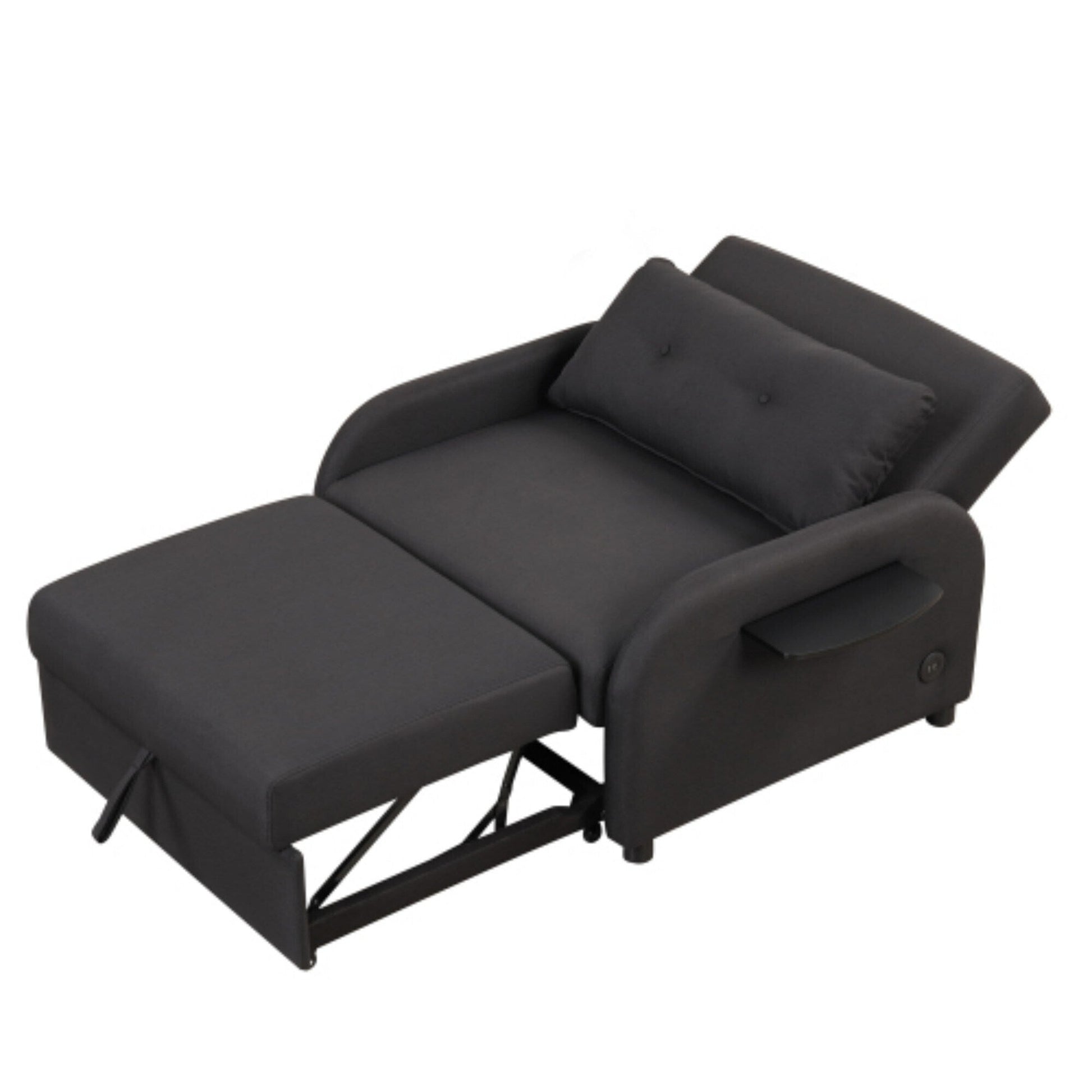 Maximize comfort and functionality with this versatile 3-in-1 Pull-Out Sofa Sleeper. Perfect for small spaces, it easily transforms from a chic sofa to a comfortable bed for guests, providing a sleek and practical solution for your home. Featuring a collapsible wing table and dual USB ports on each side, this sofa sleeper allows for convenient charging of devices while you relax. The sofa¡¯s adjustable backrest offers three different reclining angles, while the movable cushions, upholstered in soft linen fabric, provide optimal comfort. With high-density, elastic sponge filling and a sturdy iron frame, this piece is designed to support long-lasting comfort. Available in three elegant colors¡ªGrey, Black, and Beige¡ªthis pull-out sofa sleeper complements any room with ease.