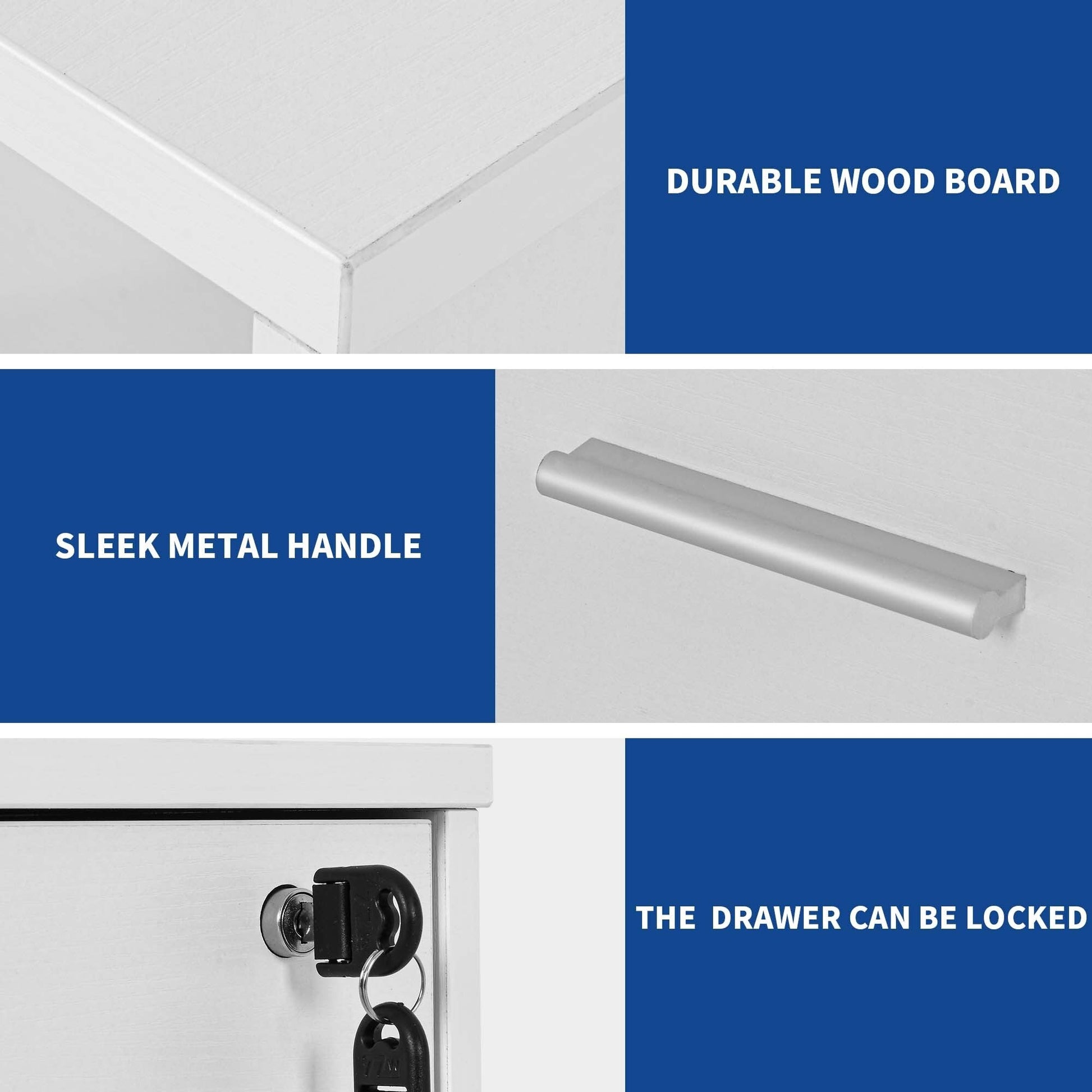 3. Gardez vos dossiers et vos objets de valeur en sécurité : Le tiroir inférieur à dossiers est équipé de barres de suspension pouvant contenir des dossiers de format A4, lettre et légal de manière organisée. Le tiroir supérieur est doté d’une serrure qui protège vos effets personnels contre tout accès non autorisé.