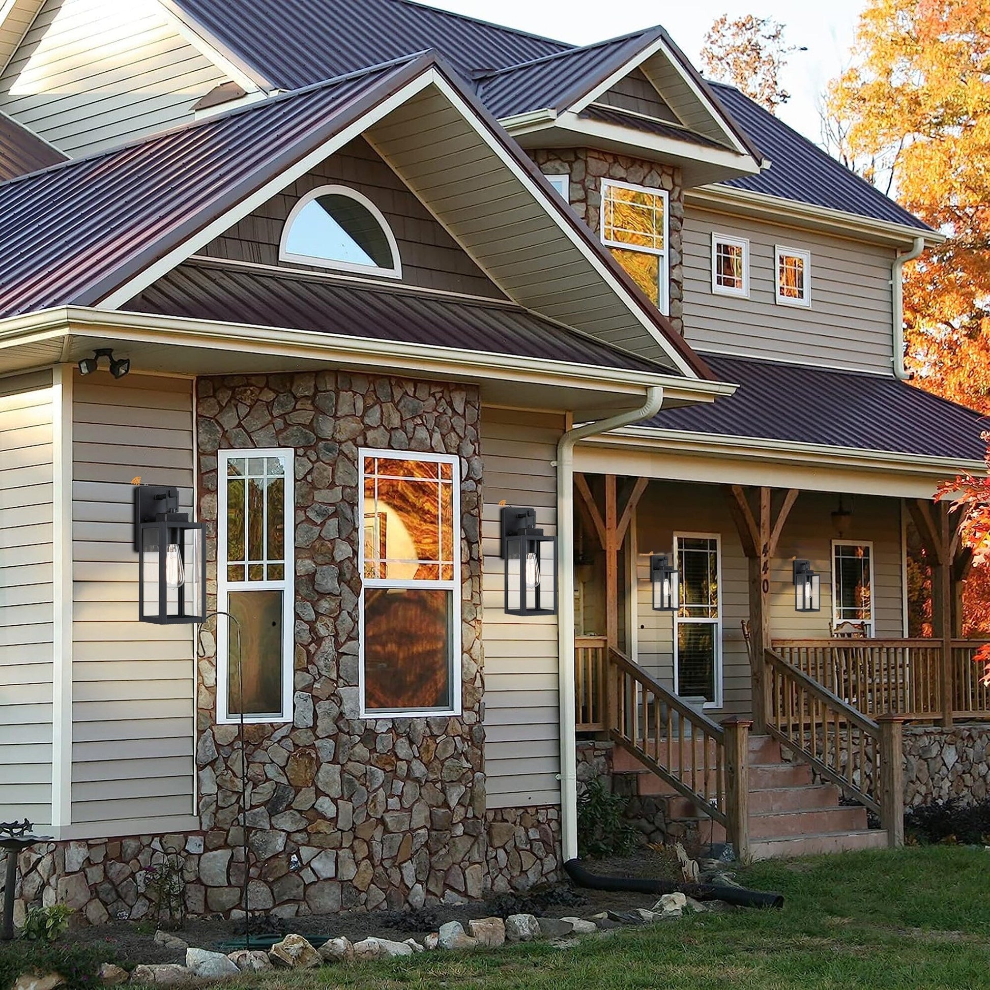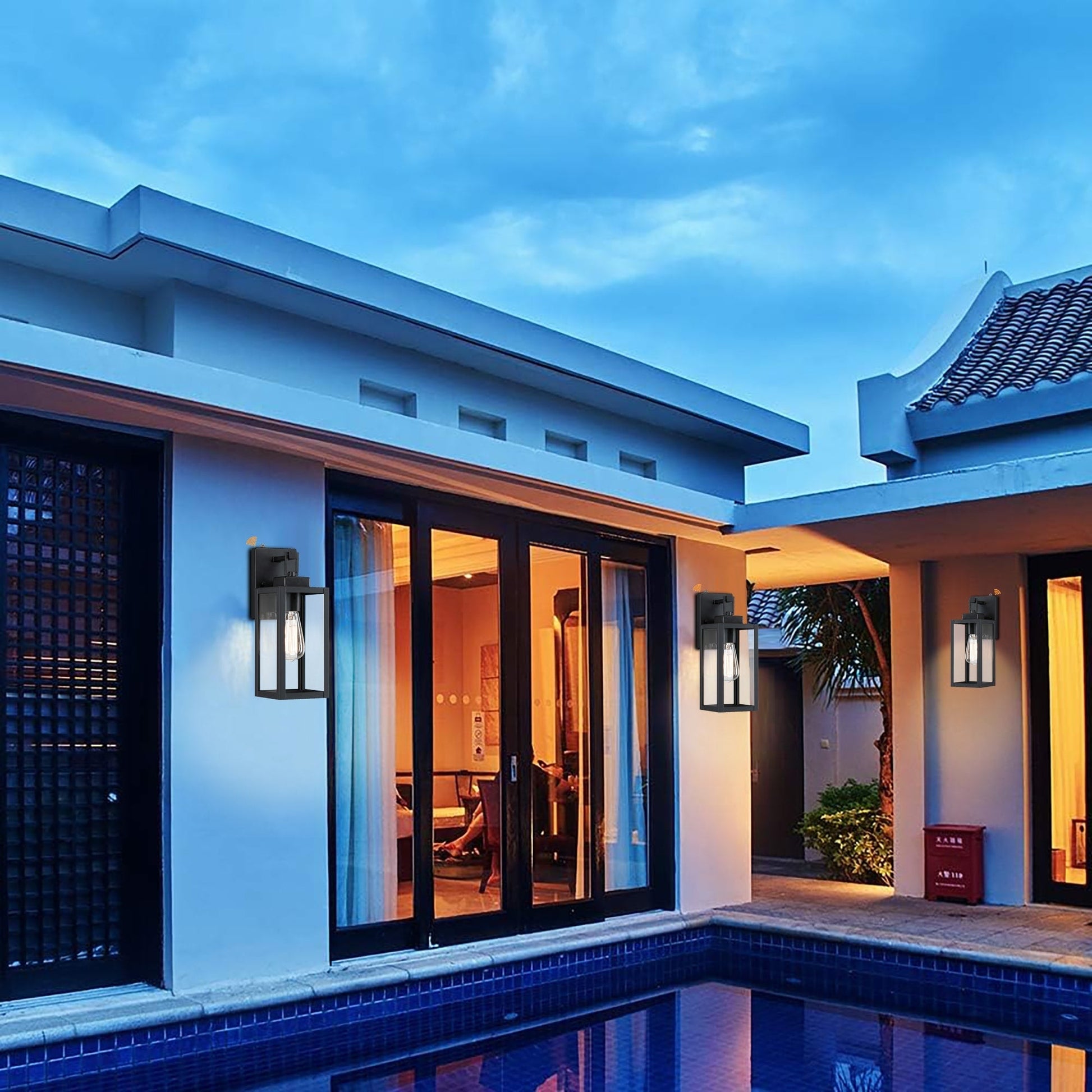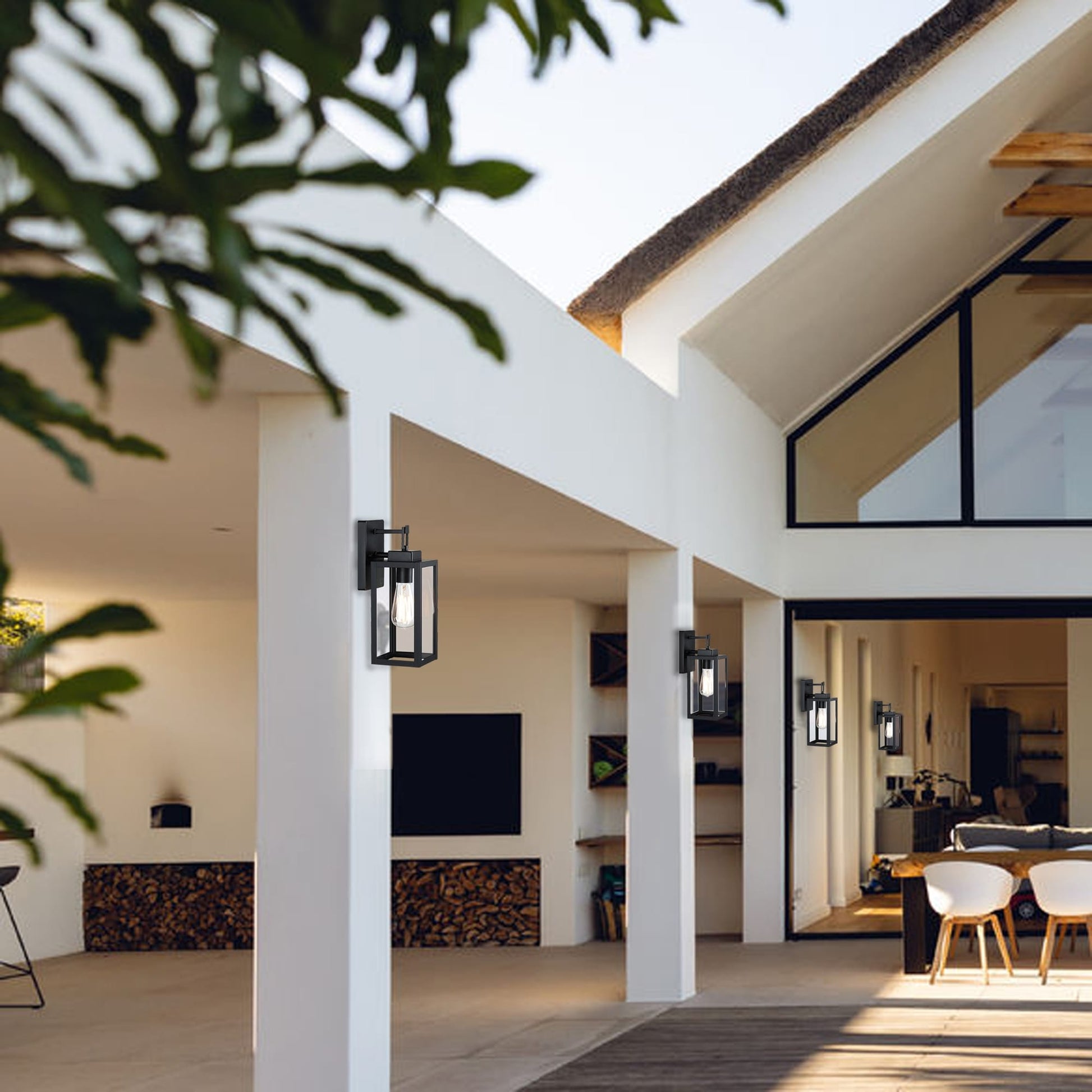 Brighten the exterior of your home and welcome your guests in a modern-inspired flair style with this rectangle shade wall lantern. The clean and classic design features a hanging arm with a clear glass roof providing excellent illumination from all sides. An antique matte black finish looks terrific, and blends well with other hardware and architectural materials, enhancing the beauty and style of your outdoor space. A square-shaped backplate easily attaches to any surface space for fuss-free installation. It's also workable for dry, or even damp environments.The most important thing is that it is a 4-Pack combination.