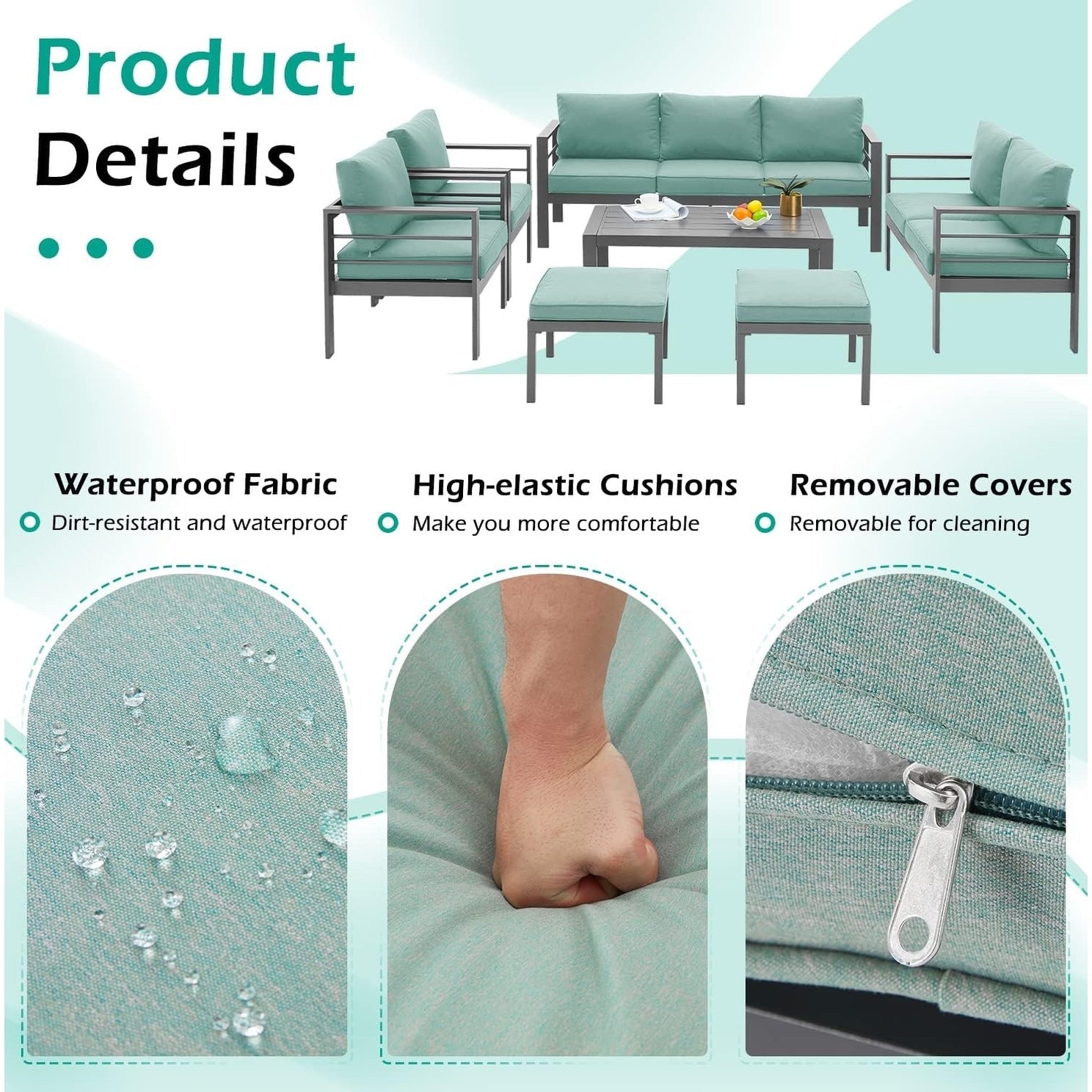 Enjoy the outdoors with the AECOJOY 7-Piece Outdoor Aluminum Conversation Set. This stylish patio set is crafted from durable aluminum with thick, water-resistant cushions and a modern design that fits in any outdoor space. It includes a 3-seat sofa, loveseat, 2 single chairs, 2 ottomans, and a coffee table, plus a middle support foot for added stability and safety. All pieces are easy to assemble with the included tools and instructions.