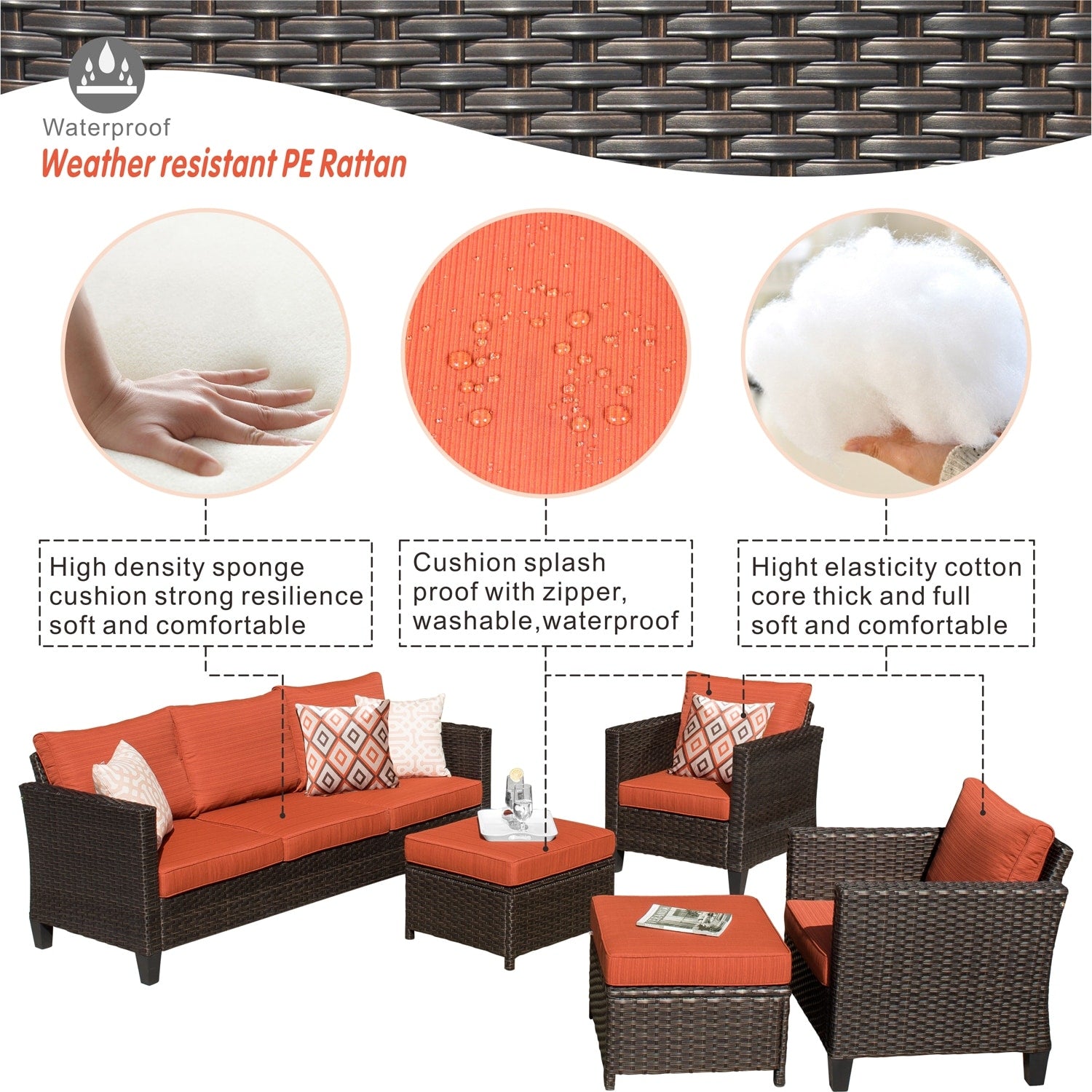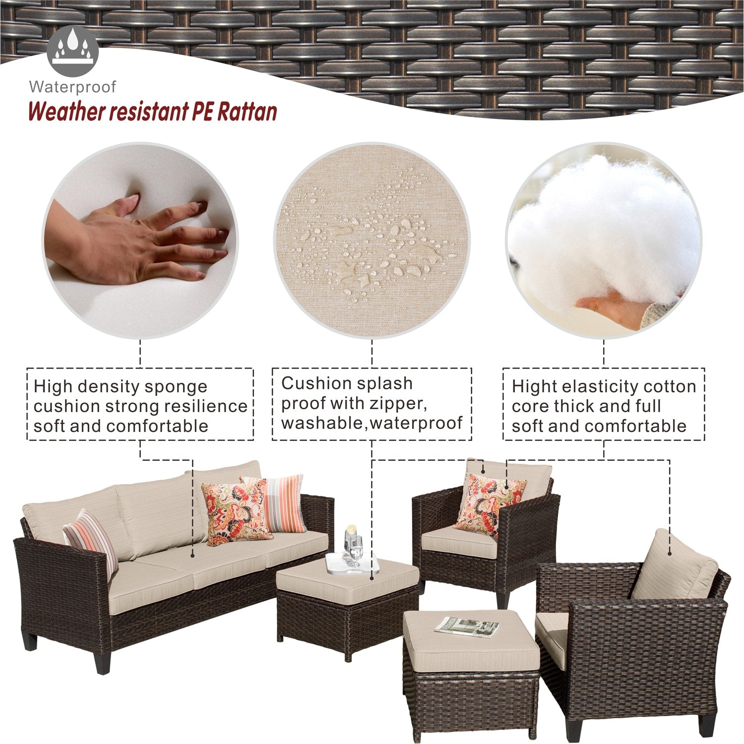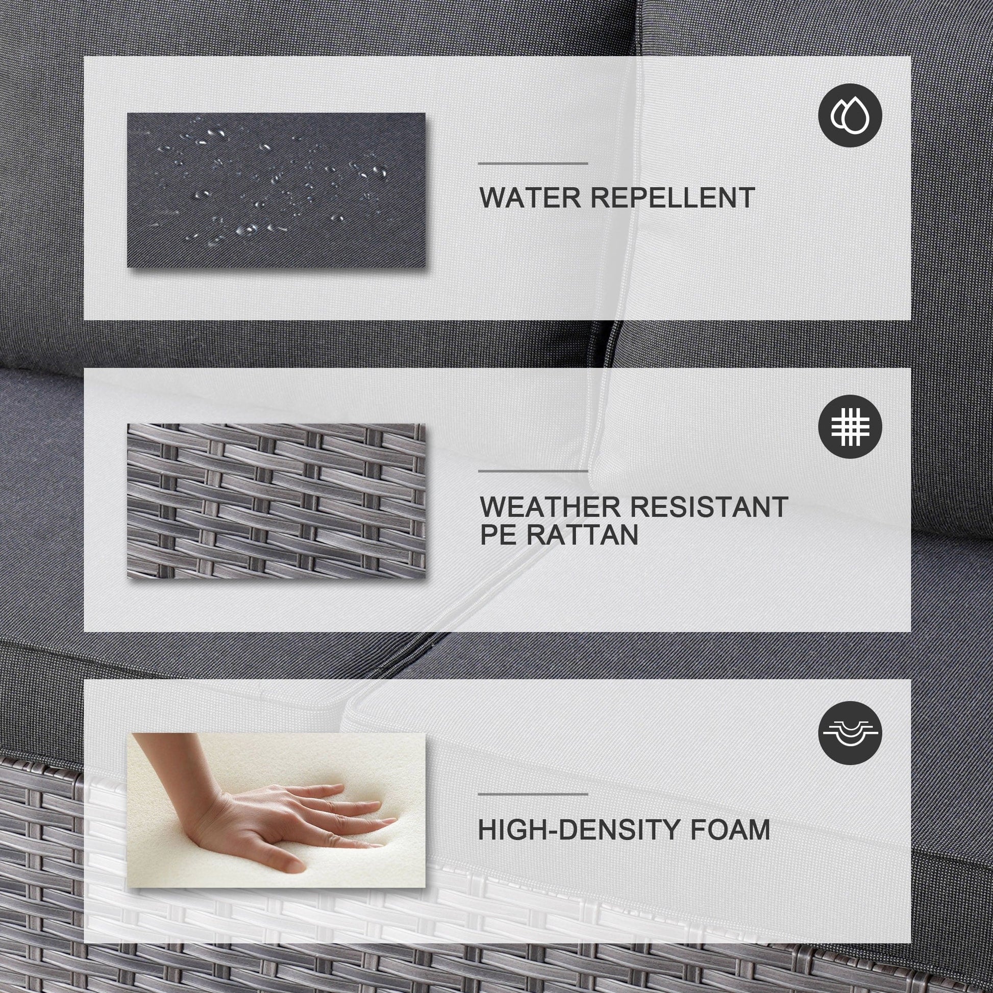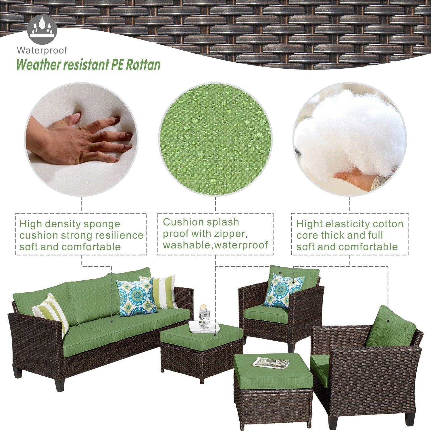 • Water-Resistant & Weather-Ready: The cushions and furniture are designed to resist water, making them ideal for withstanding light rain or snow. While this set handles most weather conditions with ease, it's best to protect it from extreme weather for longevity.