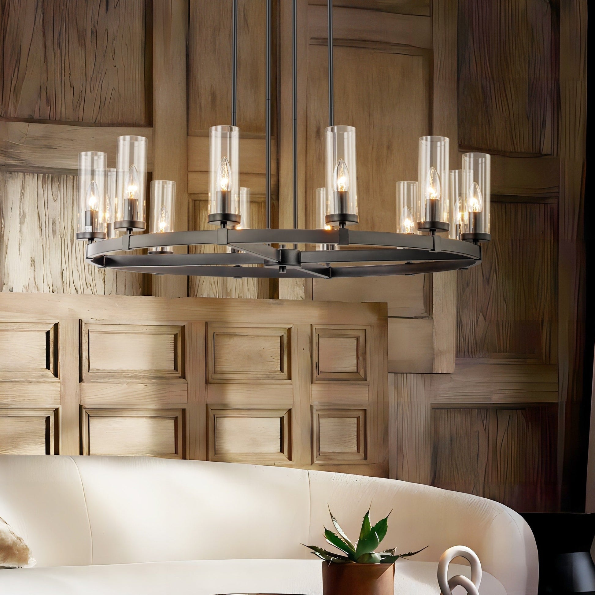 Ce lustre rond à 12 lumières de style industriel rétro, en forme de roue de charrette, avec abat-jour en verre transparent et un diamètre de 90 cm (35,4 pouces), témoigne d'un savoir-faire et d'une ingéniosité de conception inégalés. La lumière traverse l'abat-jour en verre transparent et procure un éclairage doux et ample, projetant une aura lumineuse qui enveloppe gracieusement votre espace de vie. Par ailleurs, ce luminaire opulent présente un cadre distinctif en forme de roue et un design élégant de bougies cylindriques (ampoules non incluses), dégageant une présence imposante avec une esthétique vintage industrielle prononcée.