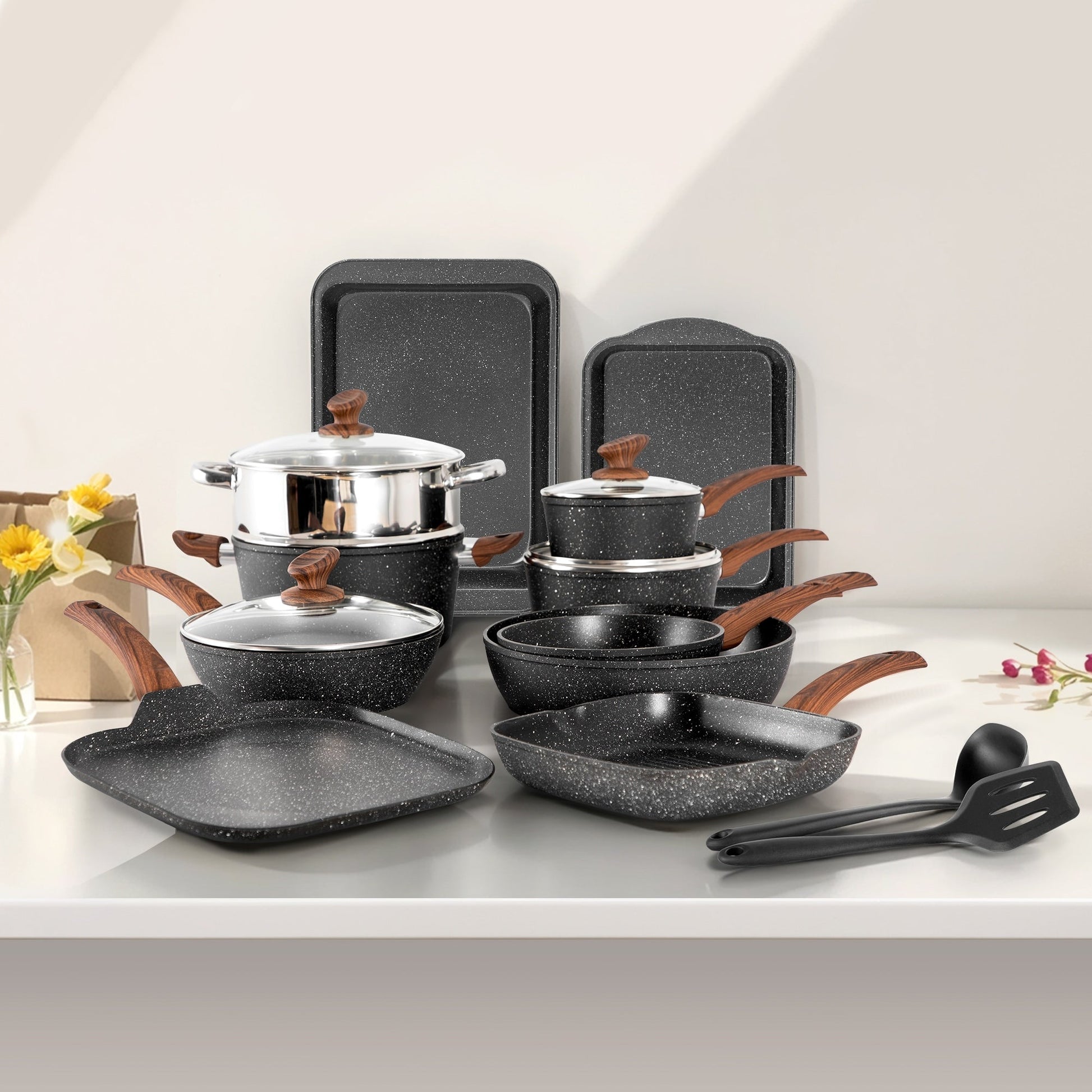 Ensemble de casseroles et poêles antiadhésives : Lors de l’achat d’ustensiles de cuisine, l’un des points importants est la performance antiadhésive. Le revêtement en granit empêche efficacement les aliments de coller. De plus, vous pourrez préparer des repas plus sains pour votre famille, car vous n’aurez pas besoin d’utiliser autant d’huile. Vous pouvez cuire en toute sécurité de la sauce tomate dans des casseroles et poêles en granit ; le goût et l’odeur de vos aliments ne changeront pas, même si vous utilisez des ingrédients acides ou à forte odeur.