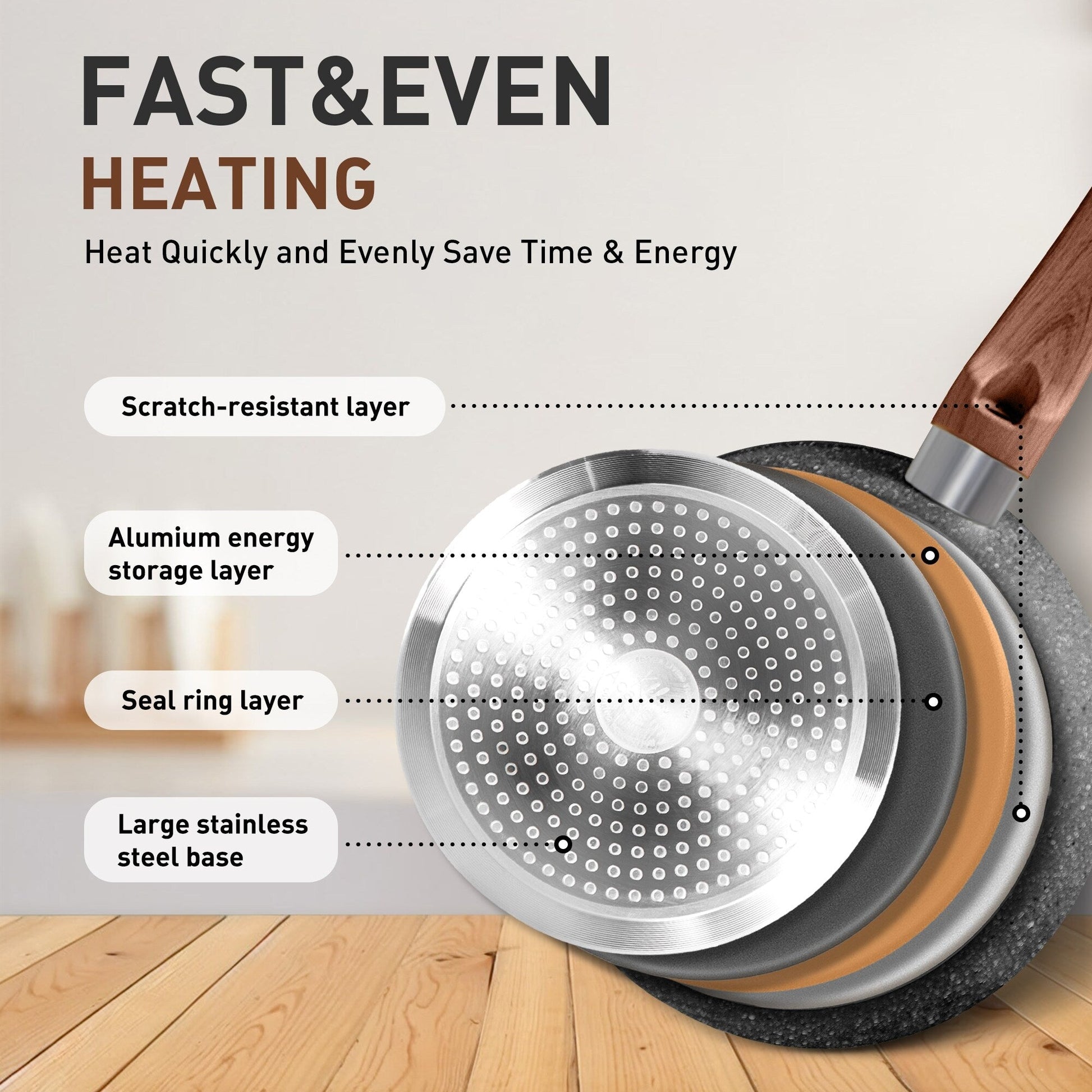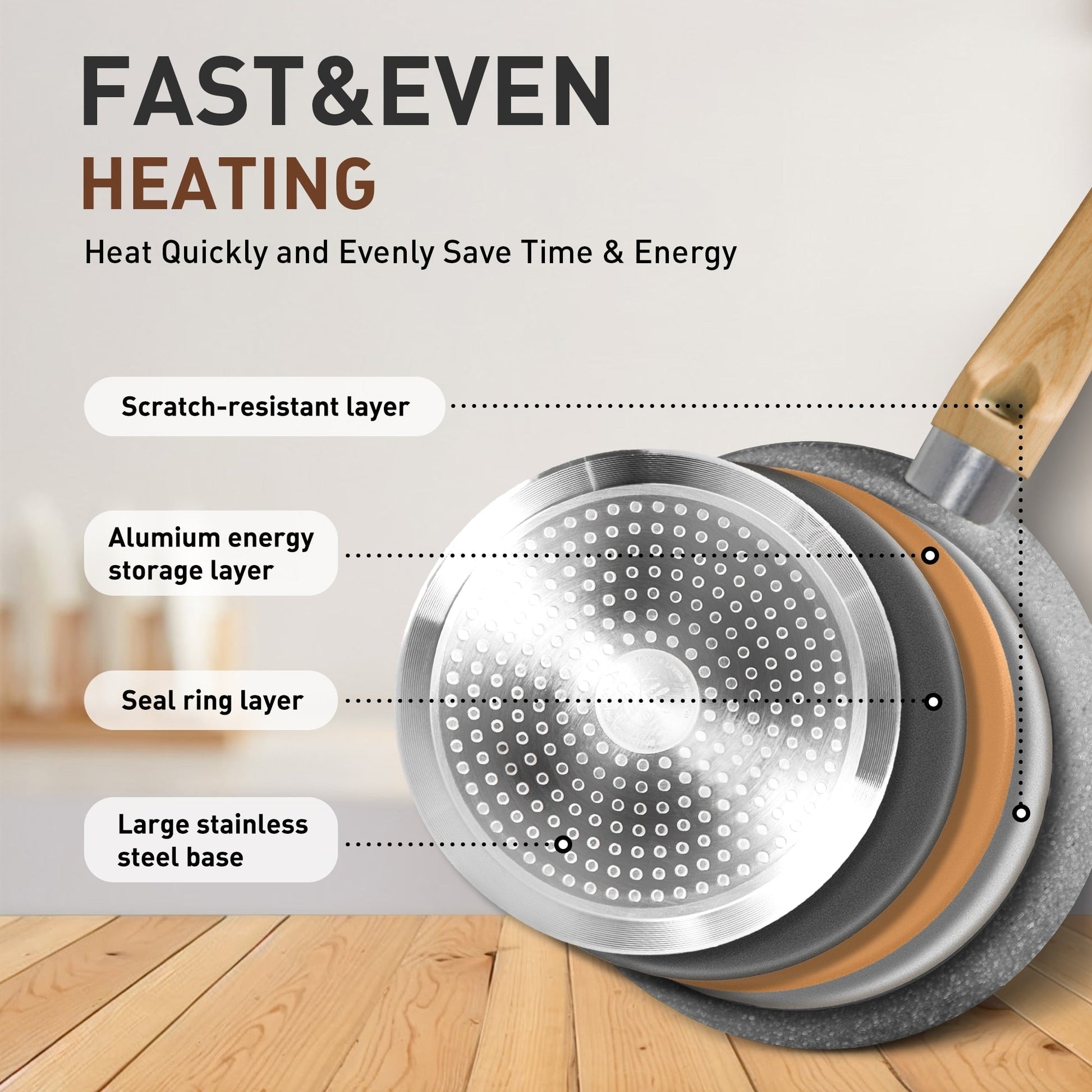Casseroles et poêles à induction : À l'intérieur, ces ustensiles de cuisine utilisent un cœur en aluminium. Le résultat est un réchauffement rapide de la poêle et, plus important encore, une répartition uniforme de la chaleur. L'ensemble de casseroles et de poêles fonctionne sur tous les principaux types de plaques de cuisson. Une large base en acier inoxydable à haute conductivité magnétique assure la compatibilité avec les plaques à induction, les cuisinières à gaz, les cuisinières électriques et surtout les cuisinières en verre.