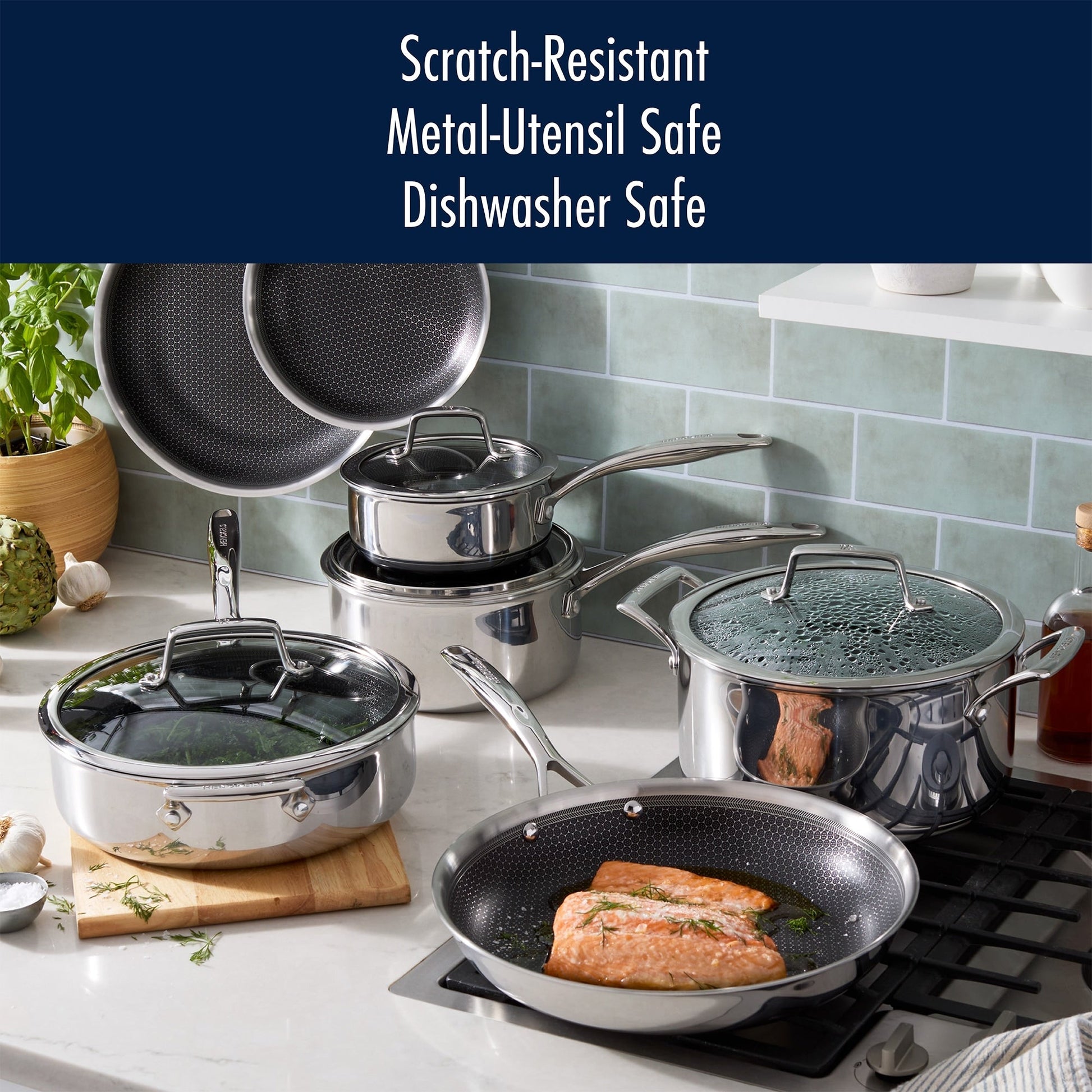 Faites rôtir et saisir sans crainte, tout en profitant d'un démoulage et d'un nettoyage faciles avec les casseroles et poêles hybrides antiadhésives HENCKELS Paradigm. Cet ensemble de poêles comprend 3 poêles polyvalentes pour la cuisine quotidienne. Faites des œufs brouillés dans la poêle de 8 pouces, faites saisir la viande et faites sauter les légumes dans la poêle de 10 pouces, et cuisinez pour une foule dans la poêle de 11 pouces. Un motif en acier inoxydable en relief et un insert antiadhésif à 3 couches combinent la polyvalence et la durabilité de l'acier inoxydable à la commodité de l'antiadhésif. Le revêtement innovant et la construction robuste en acier inoxydable tri-couches garantissent des performances exceptionnelles, que vous faisiez rôtir vos protéines préférées ou que vous prépariez des omelettes légères et moelleuses. Les caractéristiques appréciées des chefs comprennent une poignée ergonomique en forme de V qui reste froide avec une boucle de suspension pour un rangement pratique, et un bord évasé pour un versage sans dégâts. Convient au four et compatible avec tous les types de cuisinières, vous pouvez saisir sur la cuisinière puis la transférer sans problème au four. Passant au lave-vaisselle, HENCKELS Paradigm est facile à nettoyer, ce qui rend cet ustensile de cuisine facile à utiliser un plaisir à utiliser.